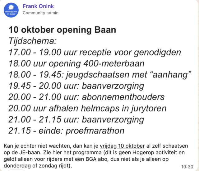"Hiermee kunnen we morgen BGA maximaal ijs geven tussen 18.00 en 20.30 uur. En het verzoek om geen proef marathon te organiseren vanwege schade aan het ijs.