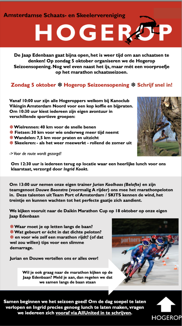 "Er is niet de jaarlijkse proefmarathon. De marathonschaatsers kunnen wel om 19.30 h rijden op het vrije uur voor onze verenigingen. En het afhalen van de helmcaps blijft mogelijk.Ook de opening om 17.00 h gaat gewoon door.